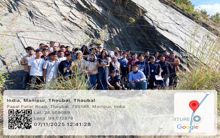A one-day geology field trip for 5th semester Civil Engineering students was conducted on 07 November 2025 along the Imphal–Kakching road section. The purpose of the visit was to enable students to observe real geological formations, rock types, structural features and slope conditions directly in the field. Faculty members interacted with students at various outcrop locations and explained the engineering relevance of different geological features. The visit helped students connect classroom concepts with practical ground conditions and enhanced their understanding of engineering geology applications in civil engineering projects. |