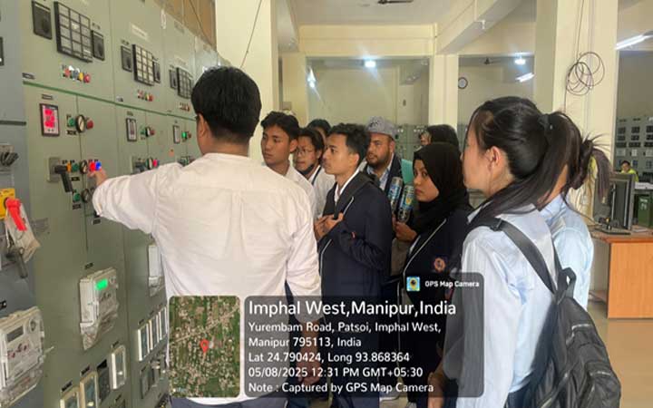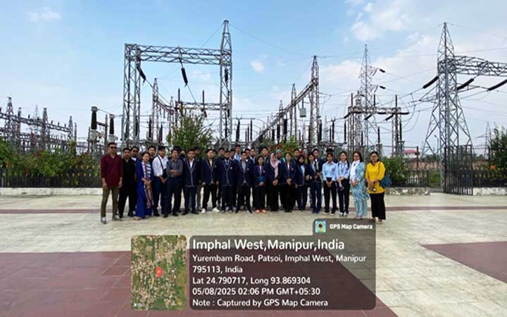 The field visit to the 132/33 kV Substation at Yurembam was aimed at providing students with practical exposure to the operation and infrastructure of a high-voltage electrical substation. The primary objective was to enhance their understanding of power transmission and distribution systems by observing real-time processes and equipment. During the visit, students had the opportunity to study the layout of the substation and the functioning of key components such as power transformers, circuit breakers, isolators, current and potential transformers, and busbars. The visit also focused on familiarizing students with the procedures for voltage step-down and its distribution to local networks. Additionally, the students gained insights into the safety measures and maintenance protocols essential for the efficient and secure operation of a substation. This field experience served as a bridge between classroom learning and real-world engineering practices, reinforcing theoretical knowledge through hands-on observation.