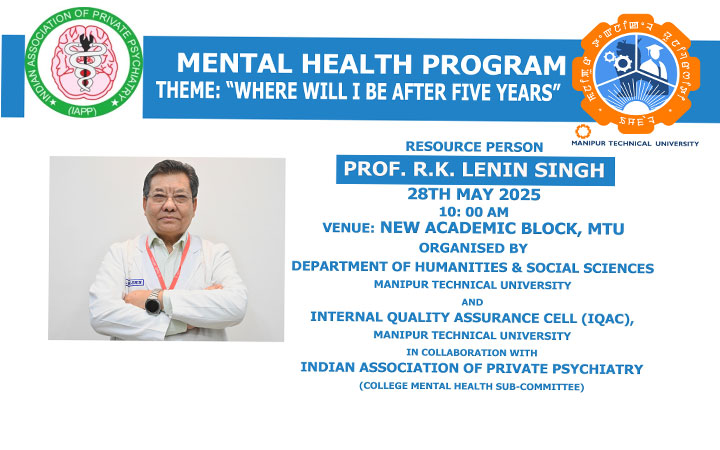 The Department of Humanities & Social Sciences, in collaboration with the Internal Quality Assurance Cell (IQAC), Manipur Technical University, and the Indian Association of Private Psychiatry (College Mental Health Sub-Committee), organized a highly engaging and insightful Mental Health Program on the theme “Where Will I Be After Five Years” on 28th May 2025. The program was held at the New Academic Block of the university and commenced at 10:00 AM.