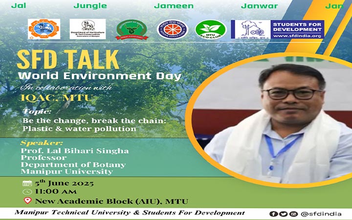 sustainable practices and individual responsibility. The event fostered a sense of environmental stewardship among the attendees and strengthened collaboration with government departments and local organizations. - Acknowledgment: We sincerely thank Professor Lal Bihari from the Department of Life Sciences, Manipur University, for his inspiring and informative lecture. We are grateful to the Registrar, Y. Ramananda Nongmeikapam, for his continued support and guidance. Special appreciation goes to the Department of Horticulture and Soil Conservation and the Forest Department, Government of Manipur, for providing the saplings. We also extend our heartfelt thanks to the Students for Development Organization, NSS volunteers, Eco Club MTU, faculty members, staff, and students of Manipur Technical University for their active participation and collective effort in making the event a success.